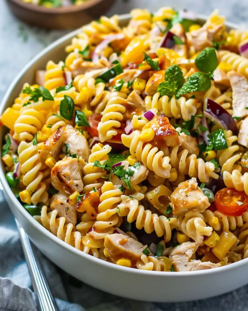 A delightful BBQ chicken pasta salad that incorporates turkey bacon for a tasty twist.