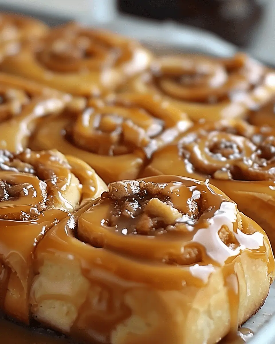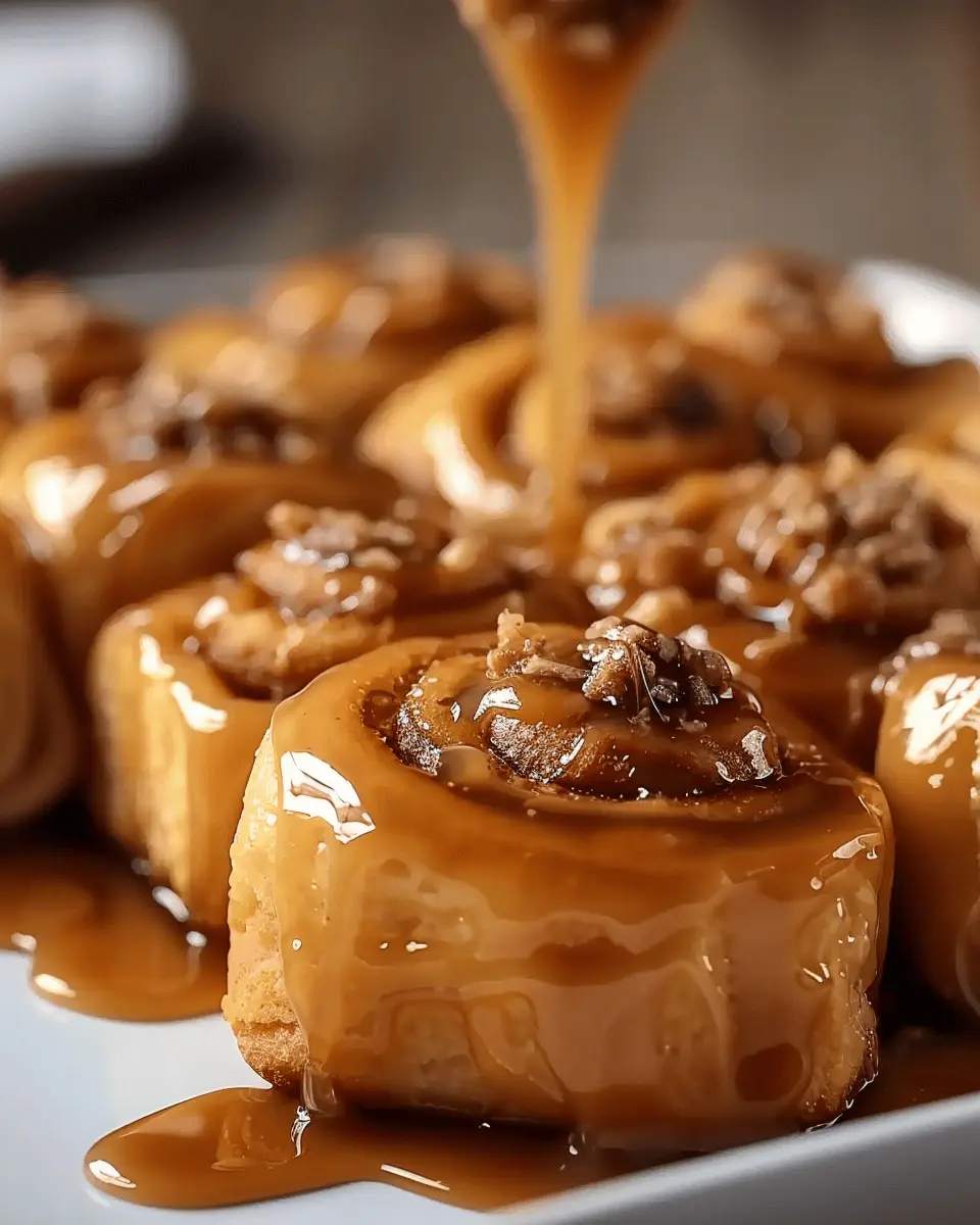 After they’ve baked to perfection, remove the rolls from the oven and let them cool for a few moments. Drizzle the prepared caramel sauce over the top while they’re still warm for that irresistibly gooey texture.