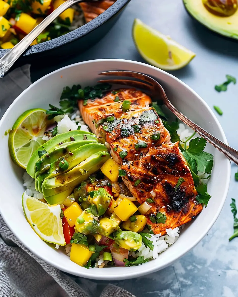 breakfast bowl recipes: Easy BBQ Salmon Bowls with Mango Avocado Salsa