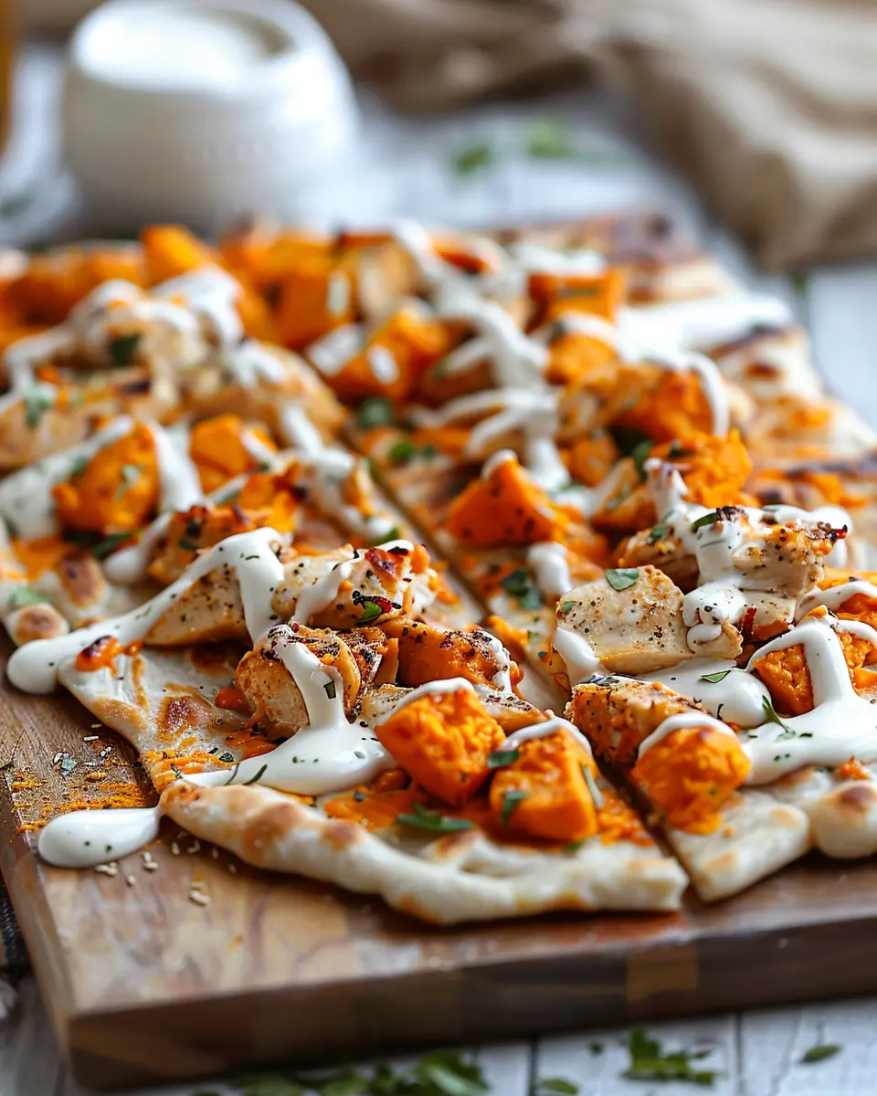 Delight in the savory combination of chicken and sweet potatoes on a warm flatbread, creating a comforting dish that’s both easy to prepare and satisfyingly delicious.