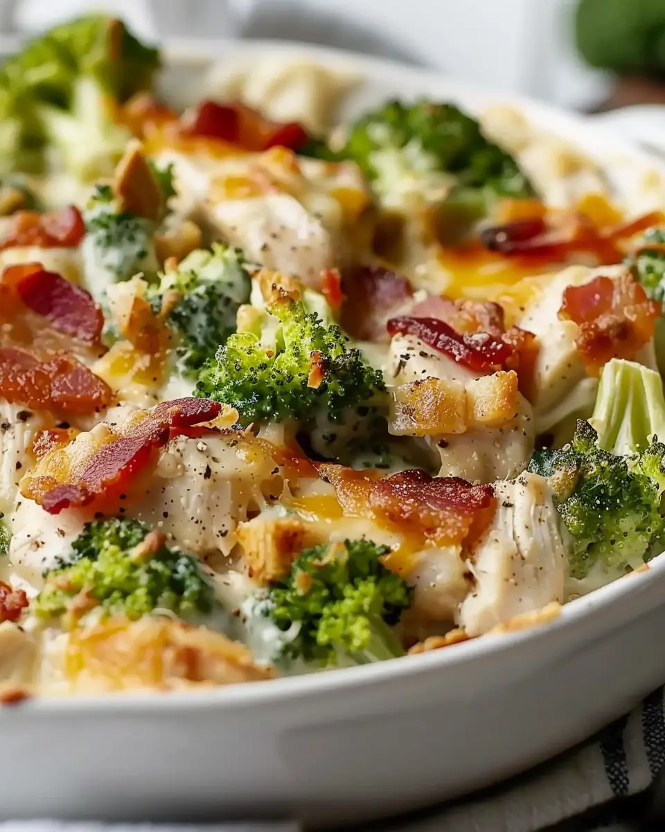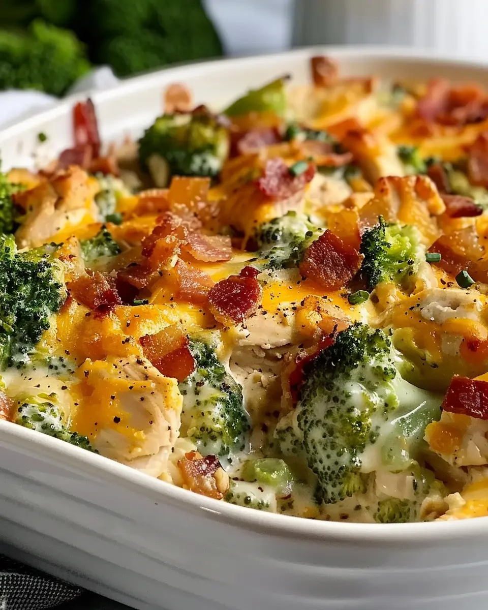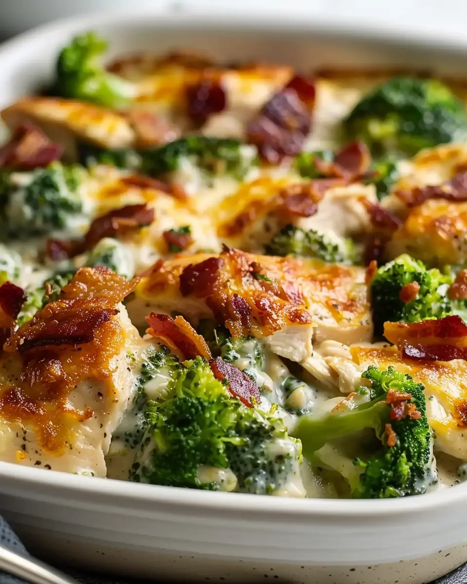 This creamy low carb chicken casserole is a delicious and healthy dish that features tender chicken, fresh broccoli, and savory turkey bacon.