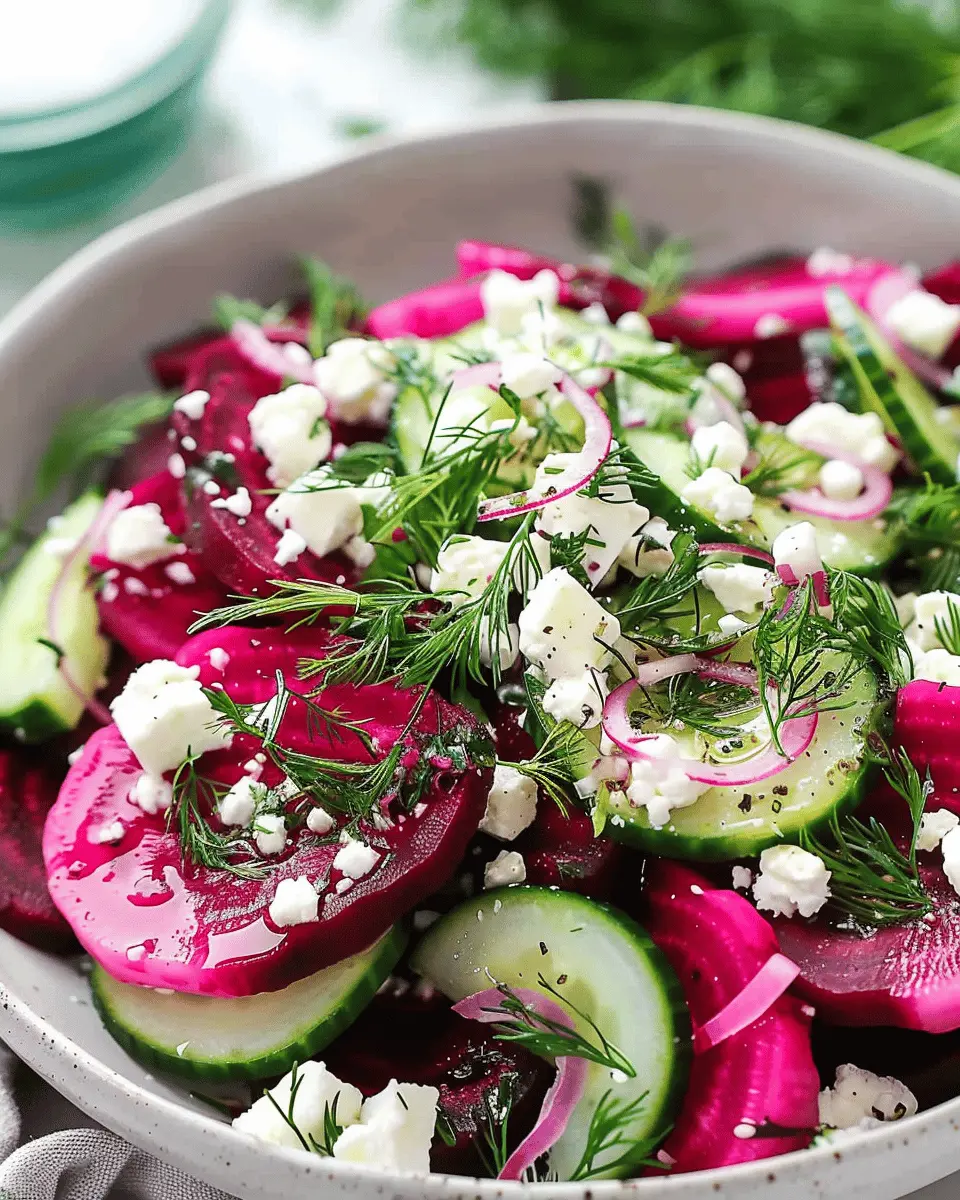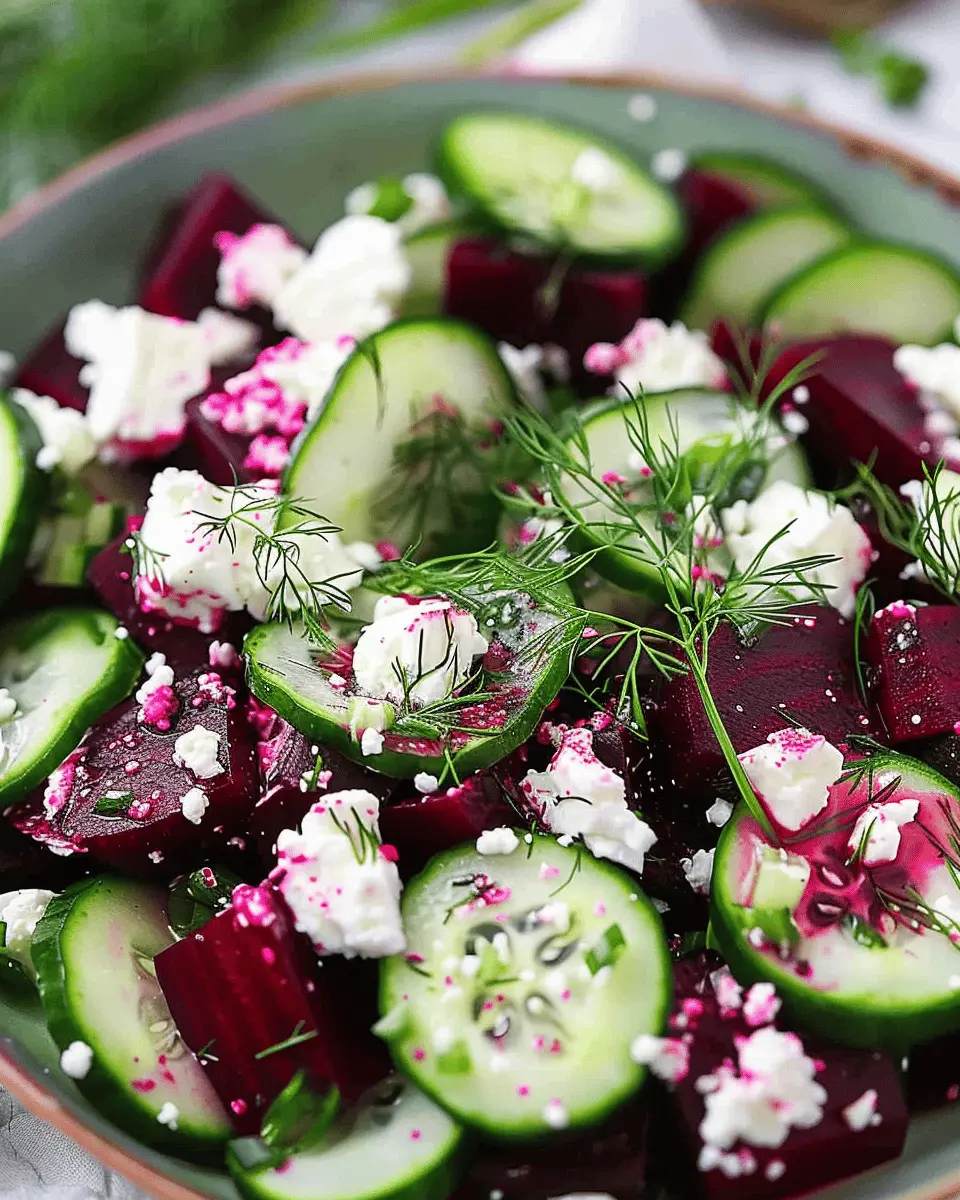 A refreshing beet salad featuring feta cheese, cucumbers, and dill, perfect for any occasion.