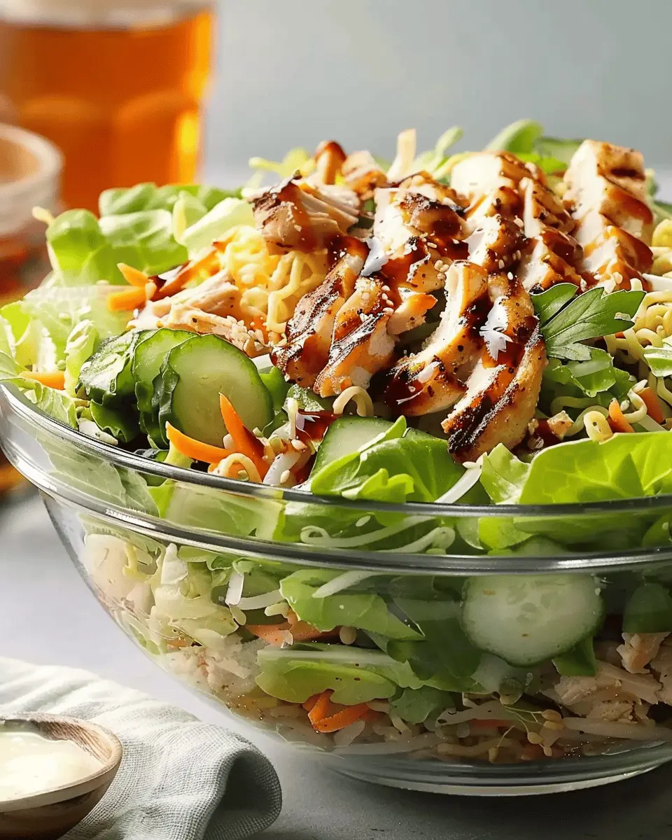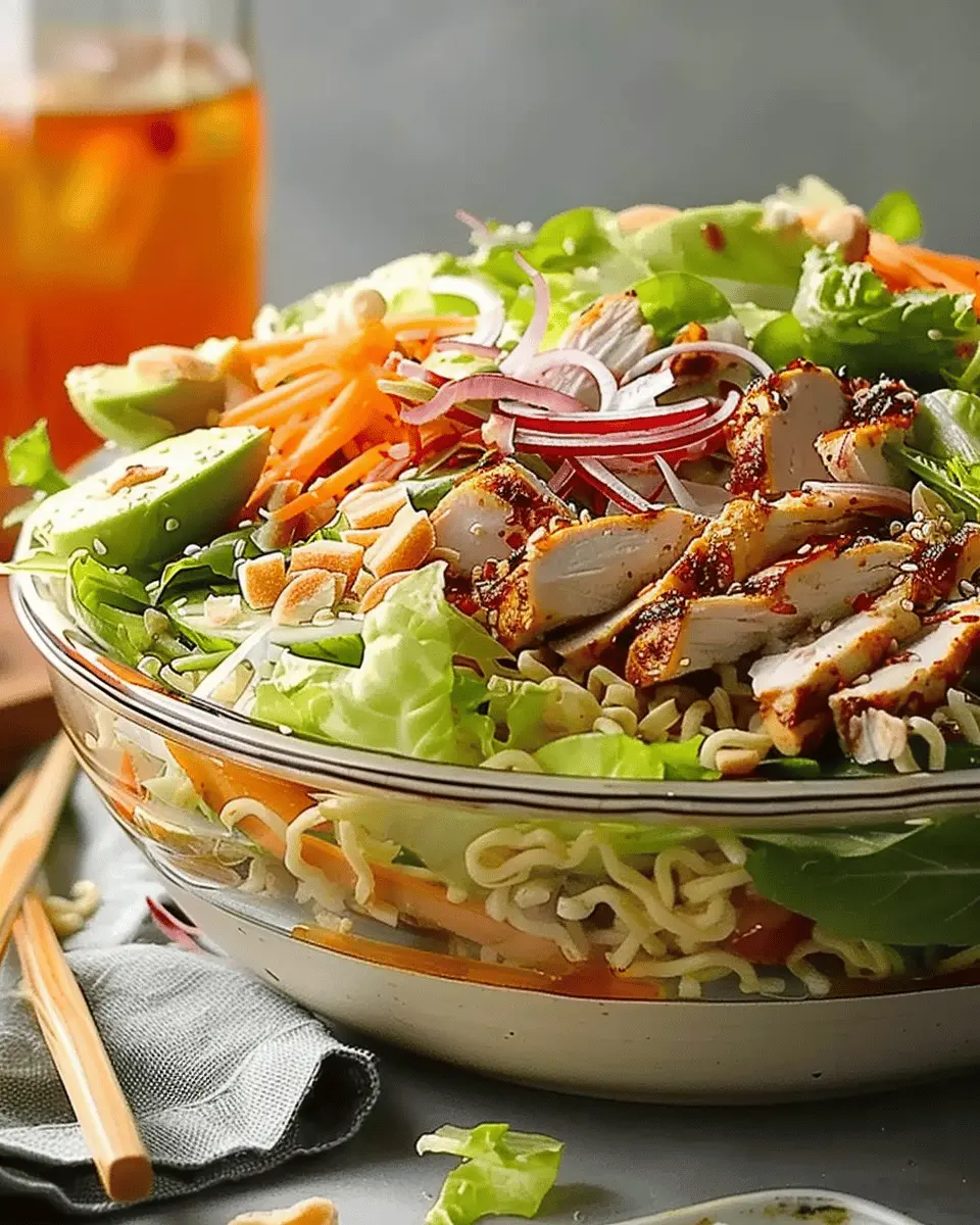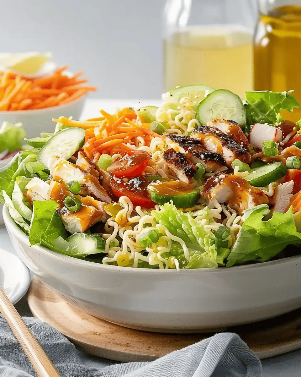 A delicious and vibrant grilled chicken ramen salad that combines flavors and textures for a delightful meal.