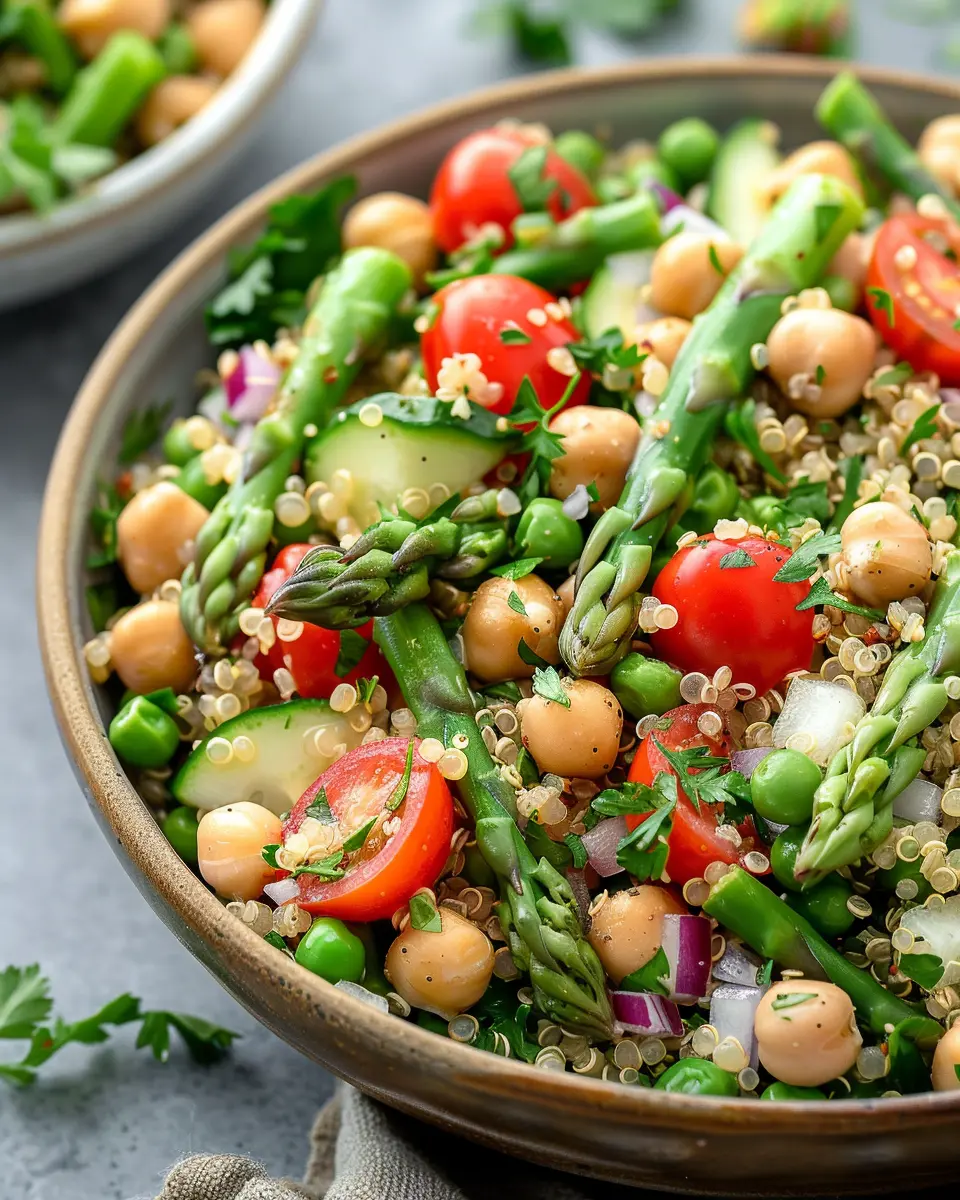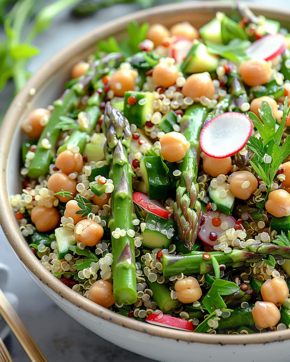 Experience the vibrant flavors of our Fresh Asparagus Chickpea Quinoa Salad, a perfect blend of nutritious ingredients that make for a delightful meal.