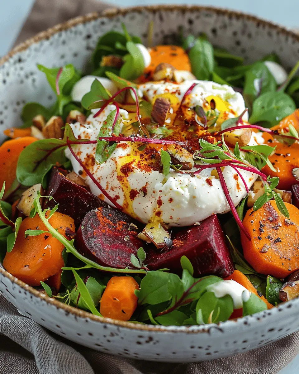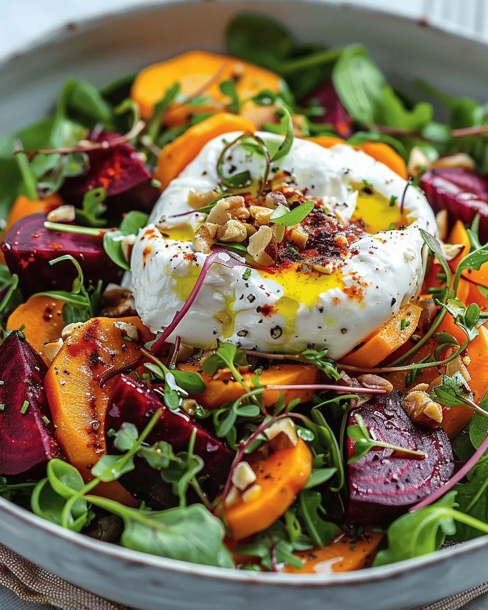 A vibrant and indulgent salad that combines the earthiness of roasted beets and sweet carrots topped with creamy burrata.