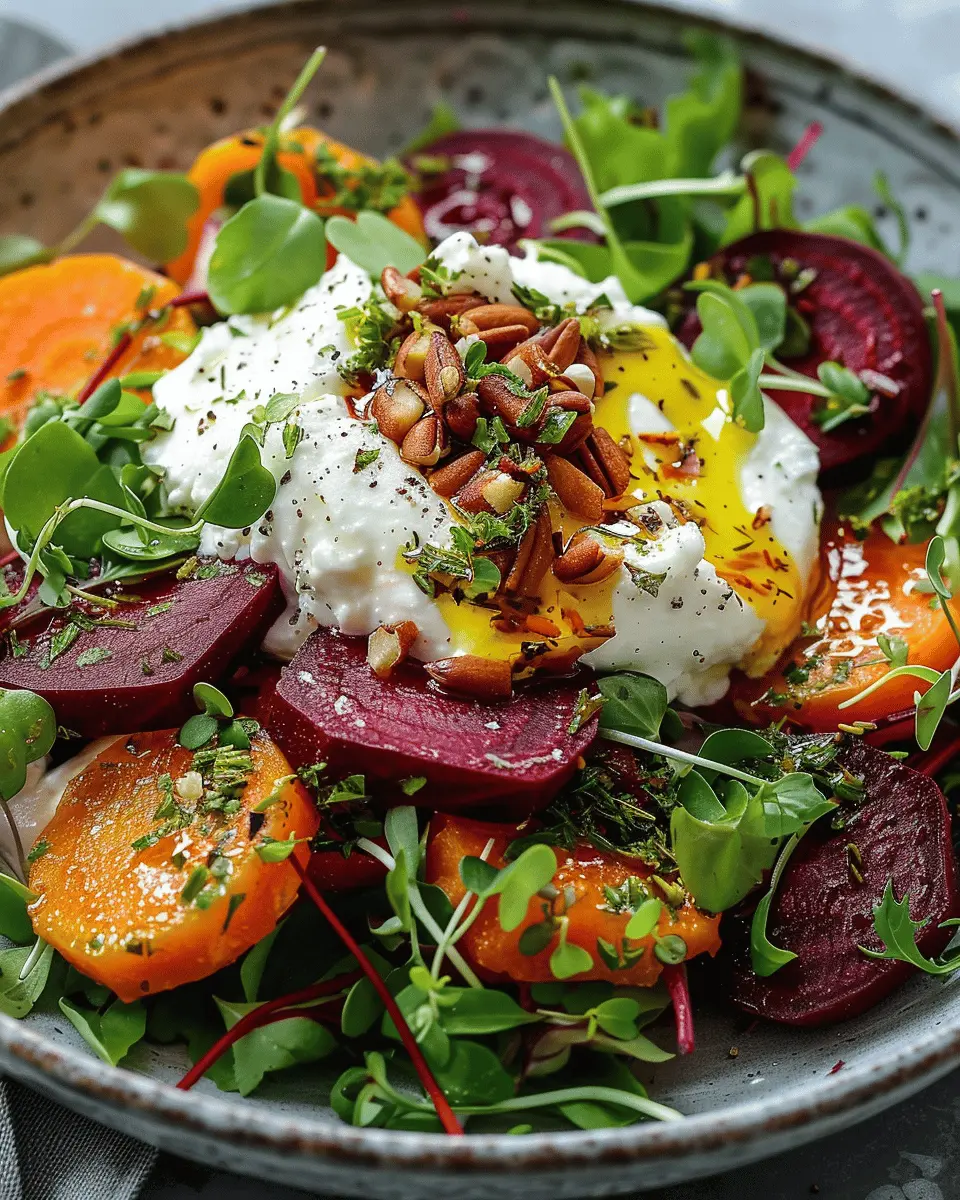 PrintDelicious Salad Recipes Ideas: Indulgent Roasted Beet and Carrot Salad with Burrata