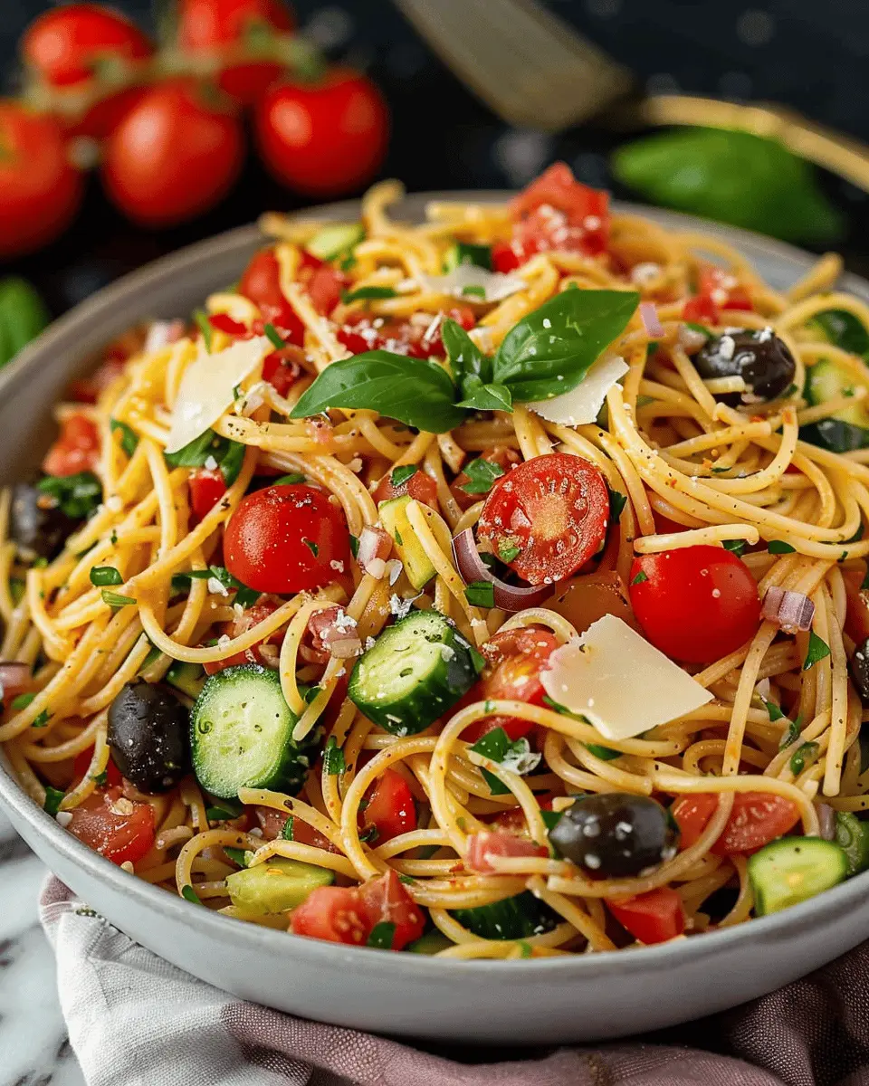 Serve your gorgeous spaghetti salad right away, or keep it cool in the fridge for an hour if you have time. This salad makes for excellent leftovers too, as the flavors continue to develop over time.