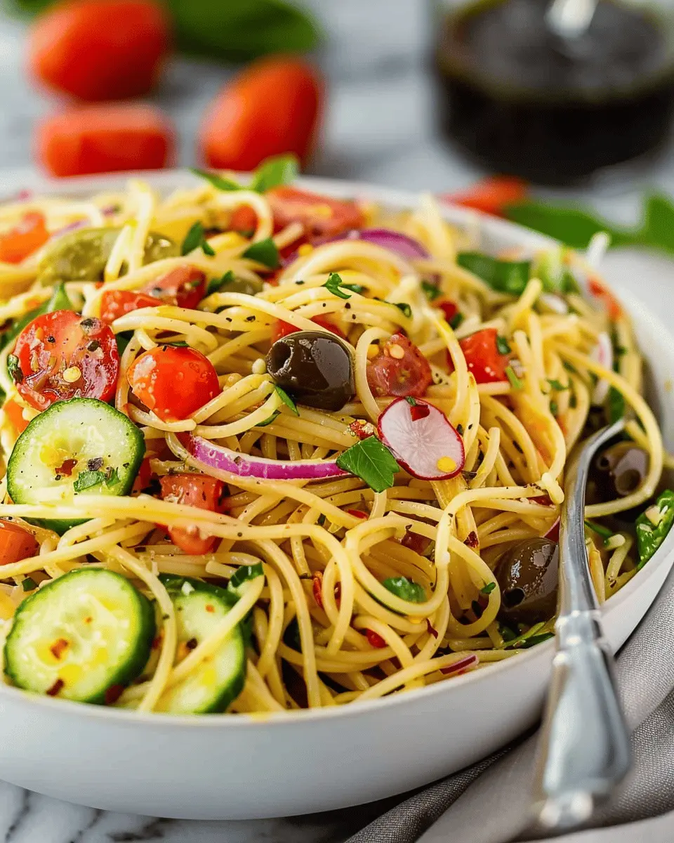 PrintDelicious Salad Recipes Ideas: Indulgent Spaghetti Salad with Italian Dressing