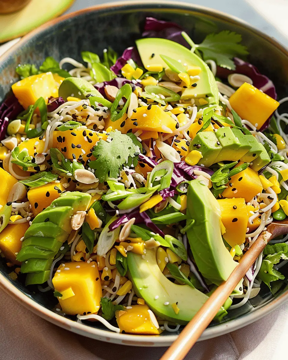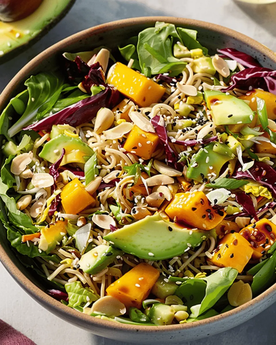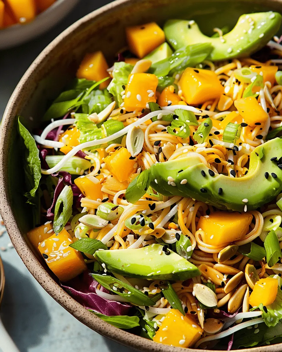 A refreshing and vibrant salad combining the sweetness of mango, the creaminess of avocado, and the unique texture of ramen noodles.