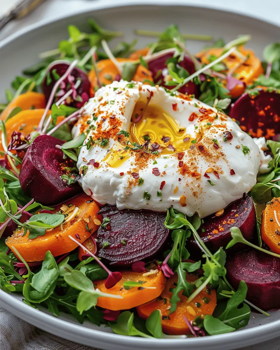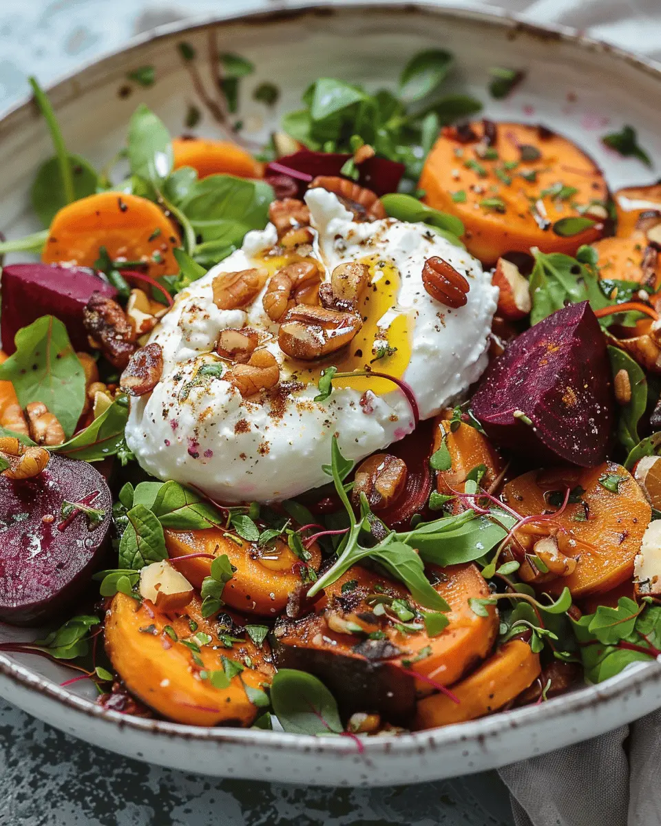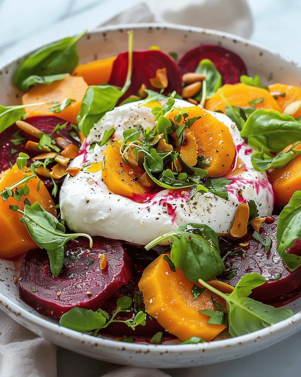 Enjoy this vibrant Roasted Beet and Carrot Salad with Burrata, packed with flavor and color.