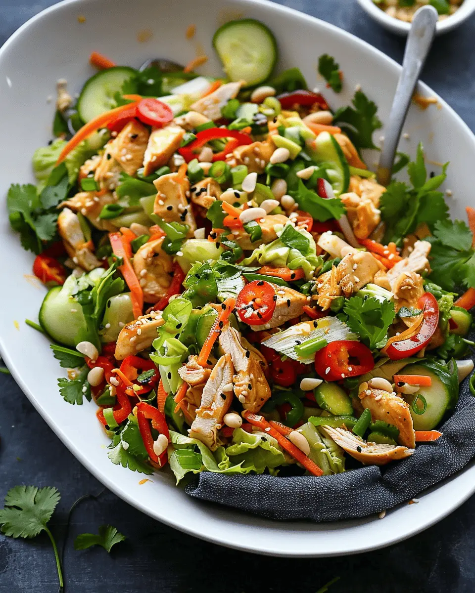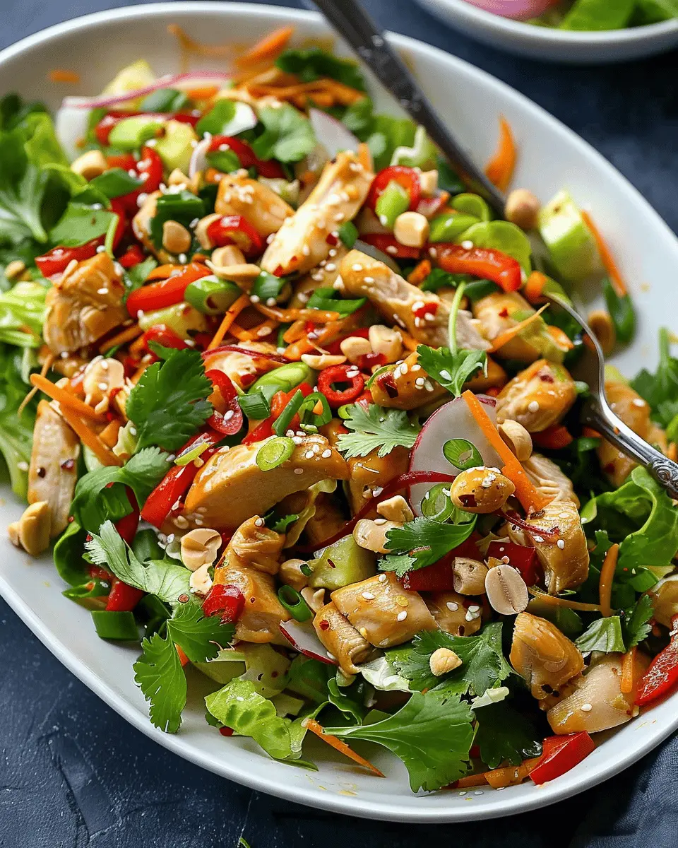A delightful Chinese Chicken Salad featuring crispy turkey bacon, a medley of fresh vegetables, and a tangy sesame dressing.