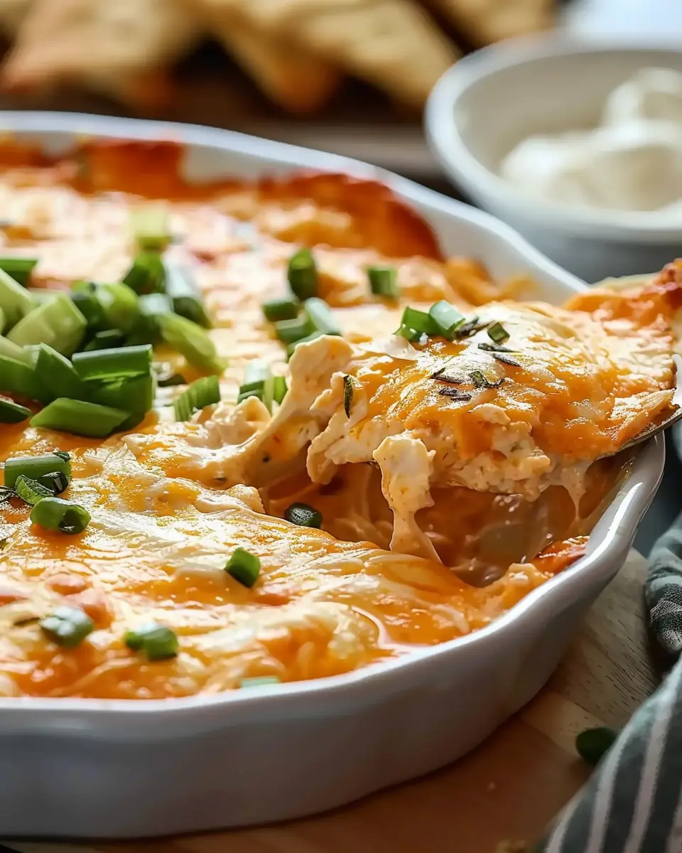 Garnish and Serve: Once removed from the oven, sprinkle with sliced green onions. Serve it hot with tortilla chips or a platter of fresh veggies.