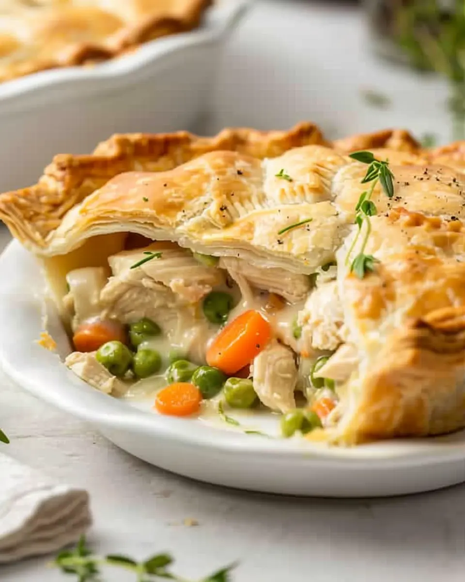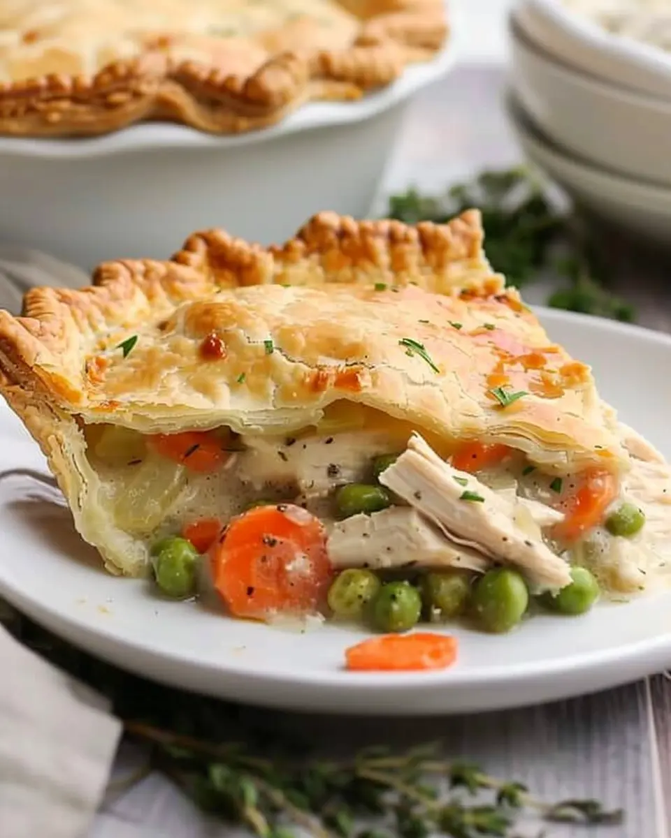 This Easy Chicken Pot Pie Recipe features Turkey Bacon and a flaky crust that makes it a delightful dish for any occasion.