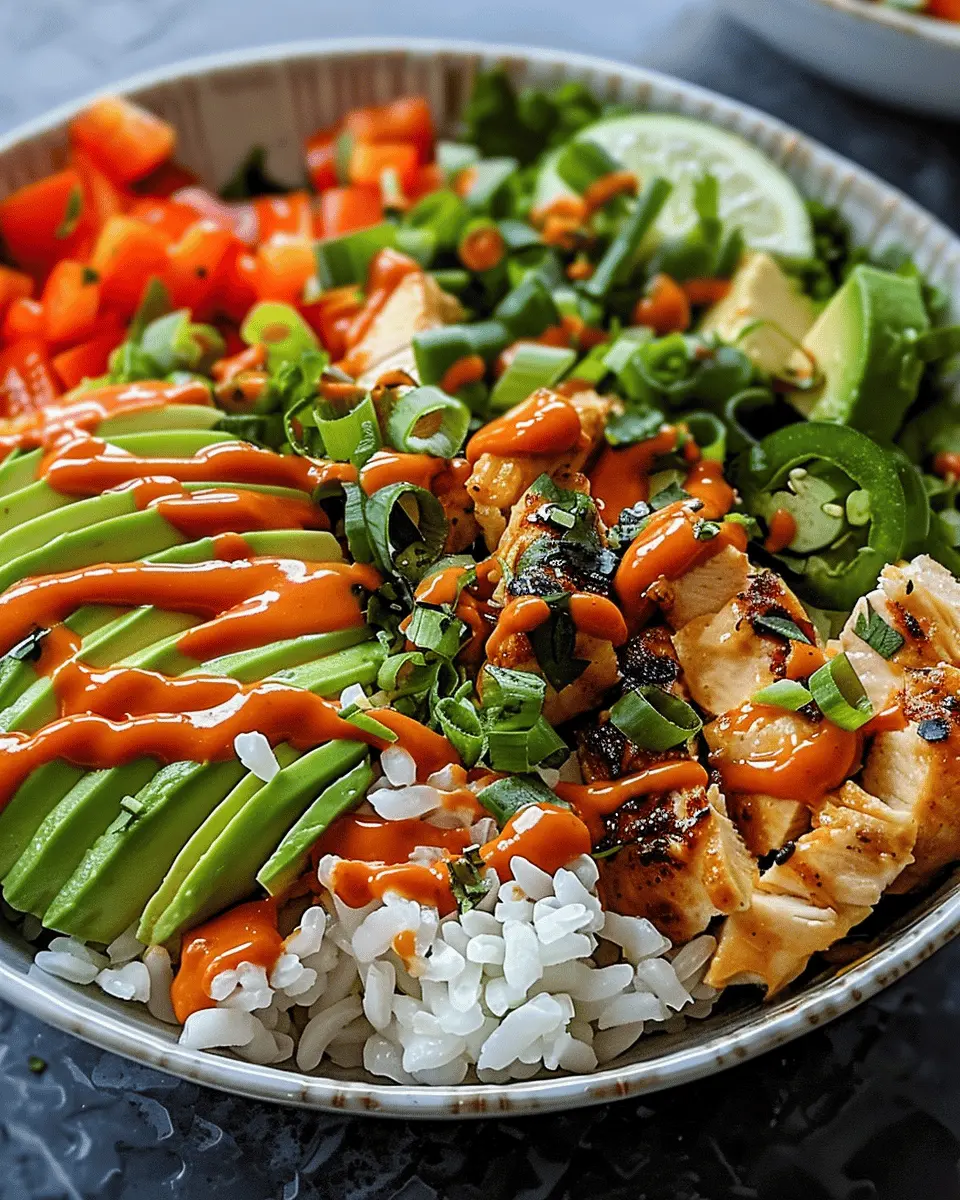 • Layer your ingredients: Start with the rice, then add the chicken, and top with vibrant veggies.