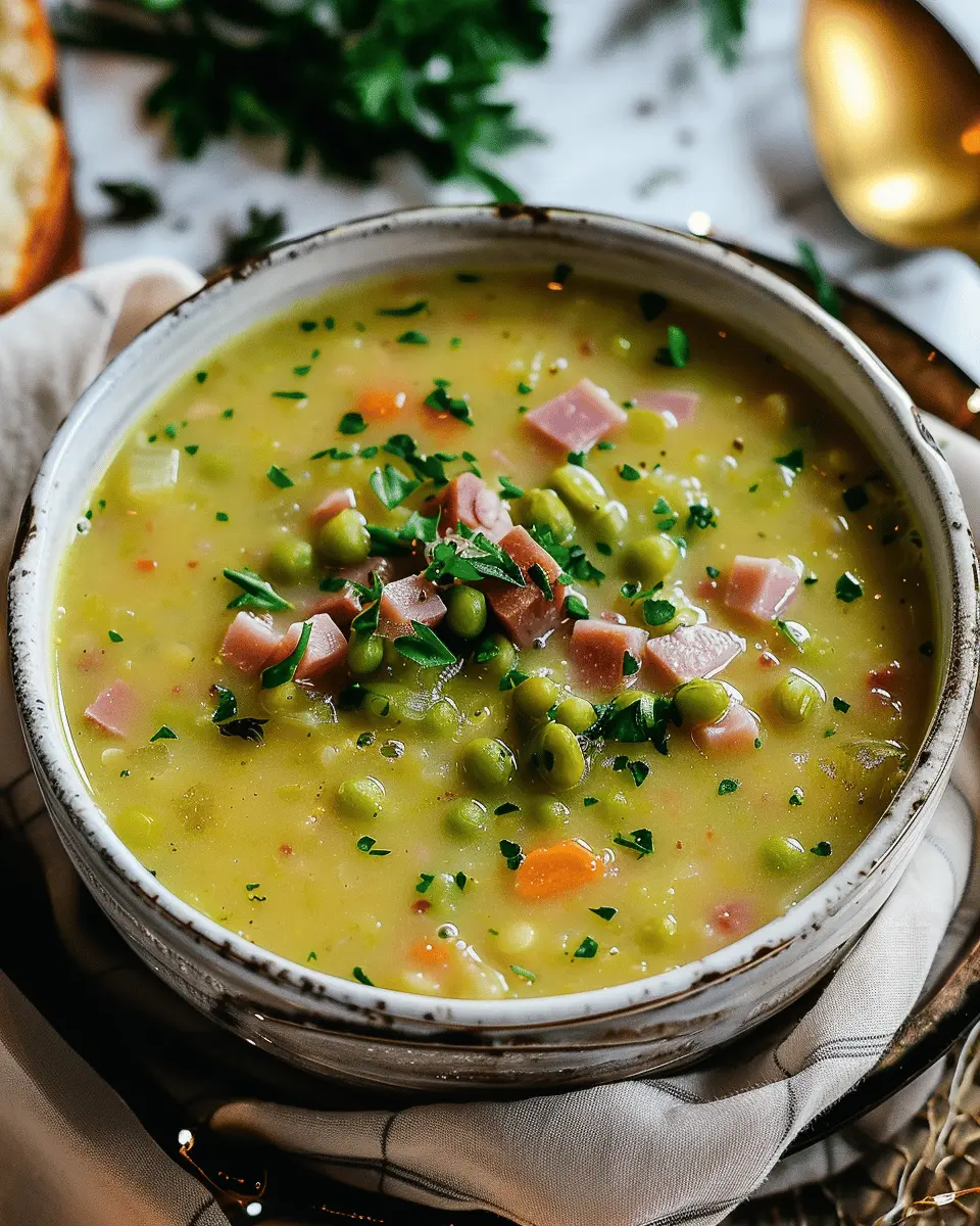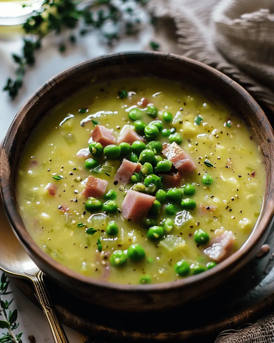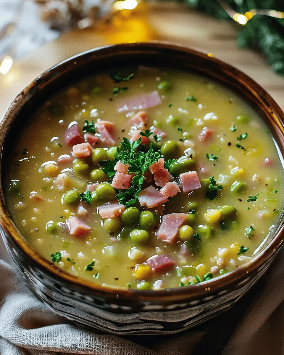 A hearty soup made with split peas and turkey bacon, perfect for a comforting meal.