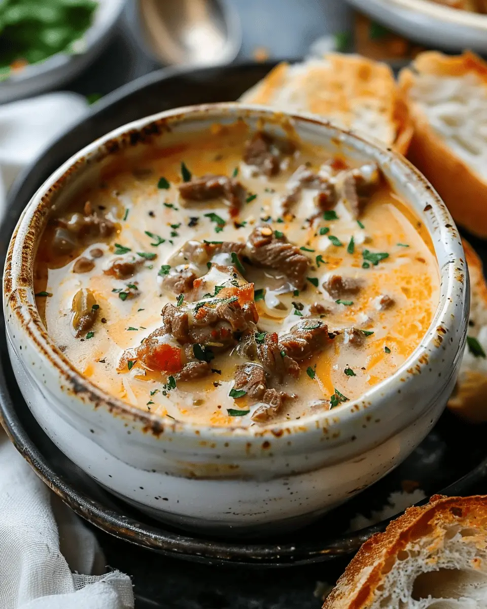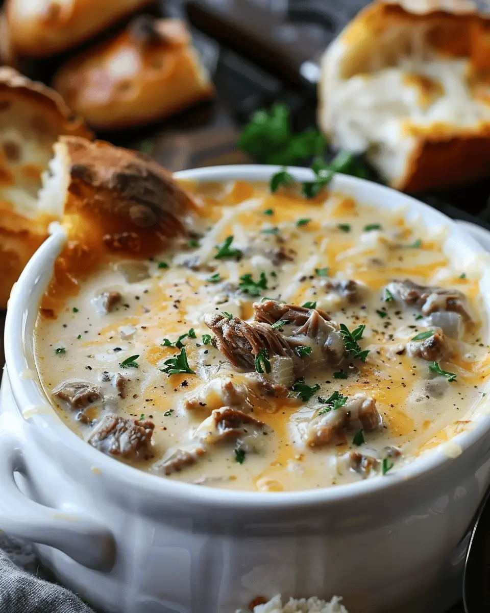 When diving into a comforting bowl of Philly Cheese Steak Soup, consider pairing it with some delicious sides and toppings. Crusty artisan bread or a warm baguette is perfect for soaking up every last drop. For toppings, a sprinkle of fresh parsley or chives adds a pop of color and a fresh flavor kick. If you’re feeling adventurous, try adding sautéed mushrooms or caramelized onions for an extra layer of taste. And don’t forget that gooey provolone cheese—because what’s a cheese steak without it?