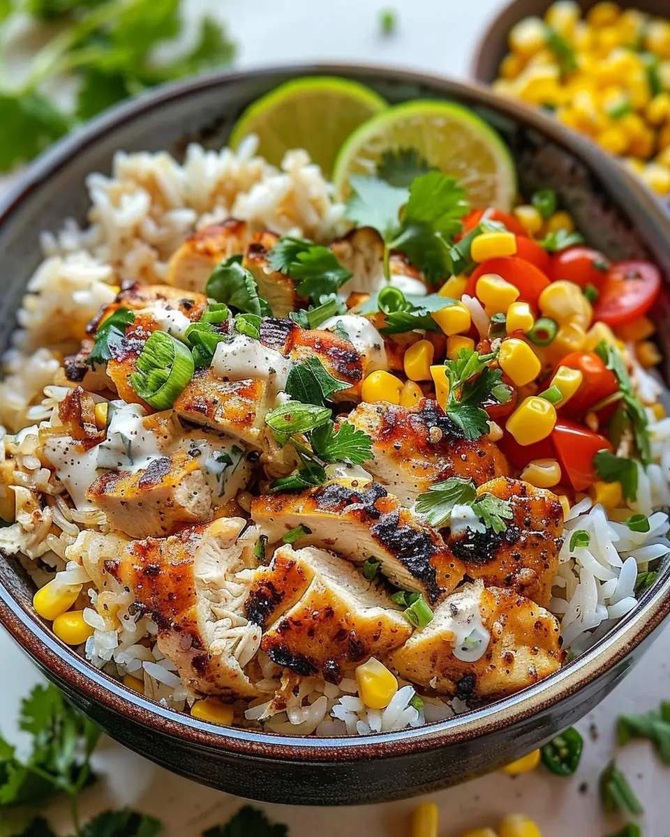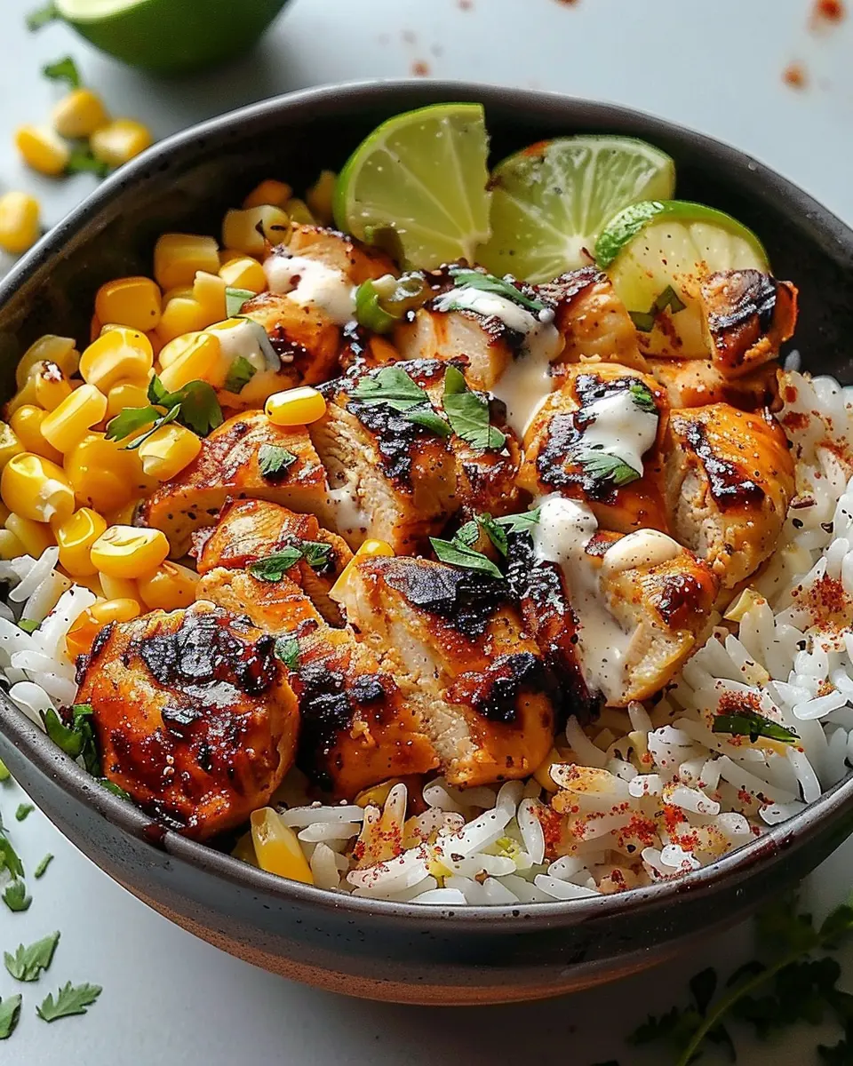 Now that all components are prepared, itโs time to bring everything together! In a bowl, start with a generous portion of fluffy rice. Top it with the cooked chicken, followed by a heaping scoop of the street corn mixture.