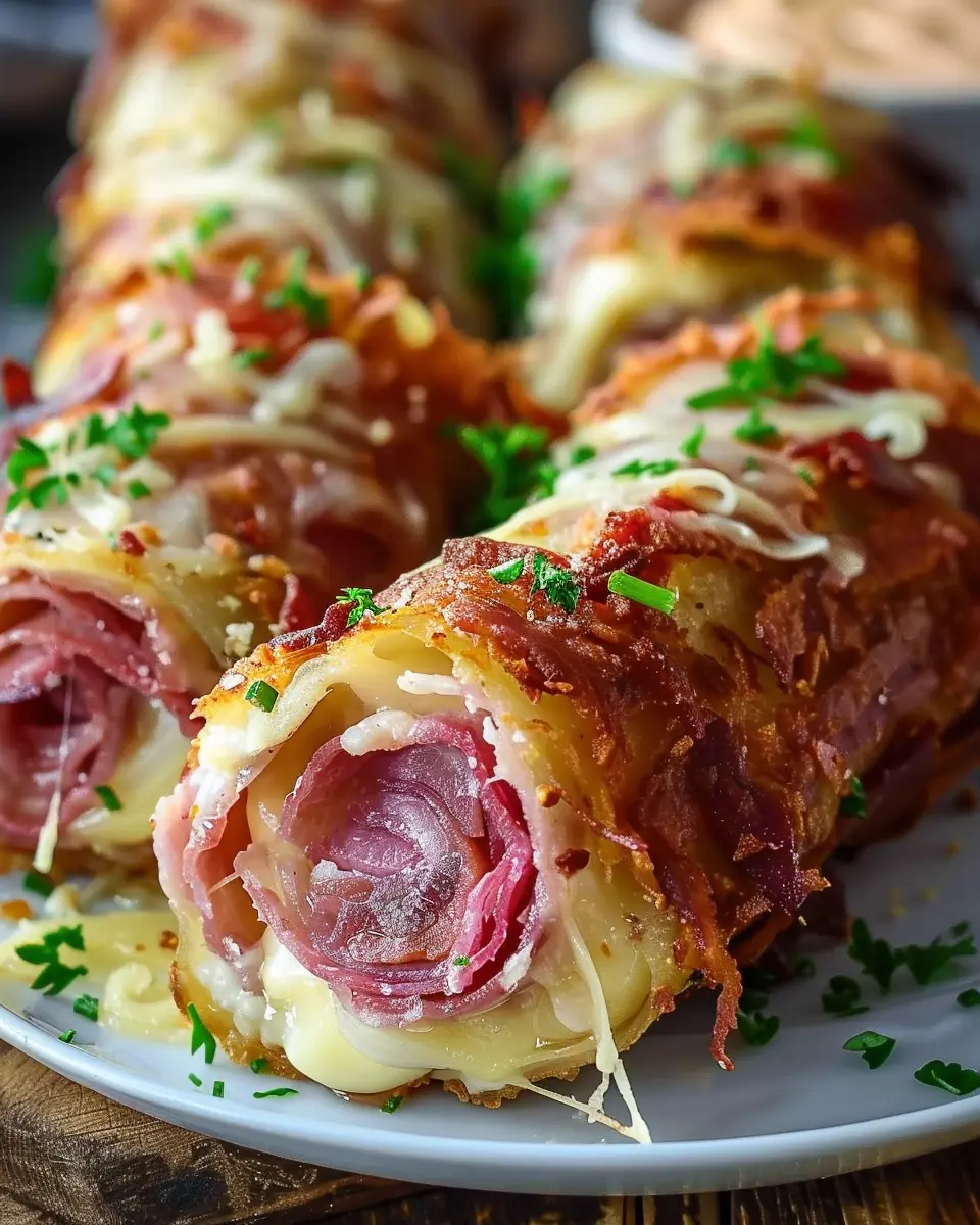 Keto Crispy Reuben Roll-Ups with Turkey Bacon and Chicken Ham