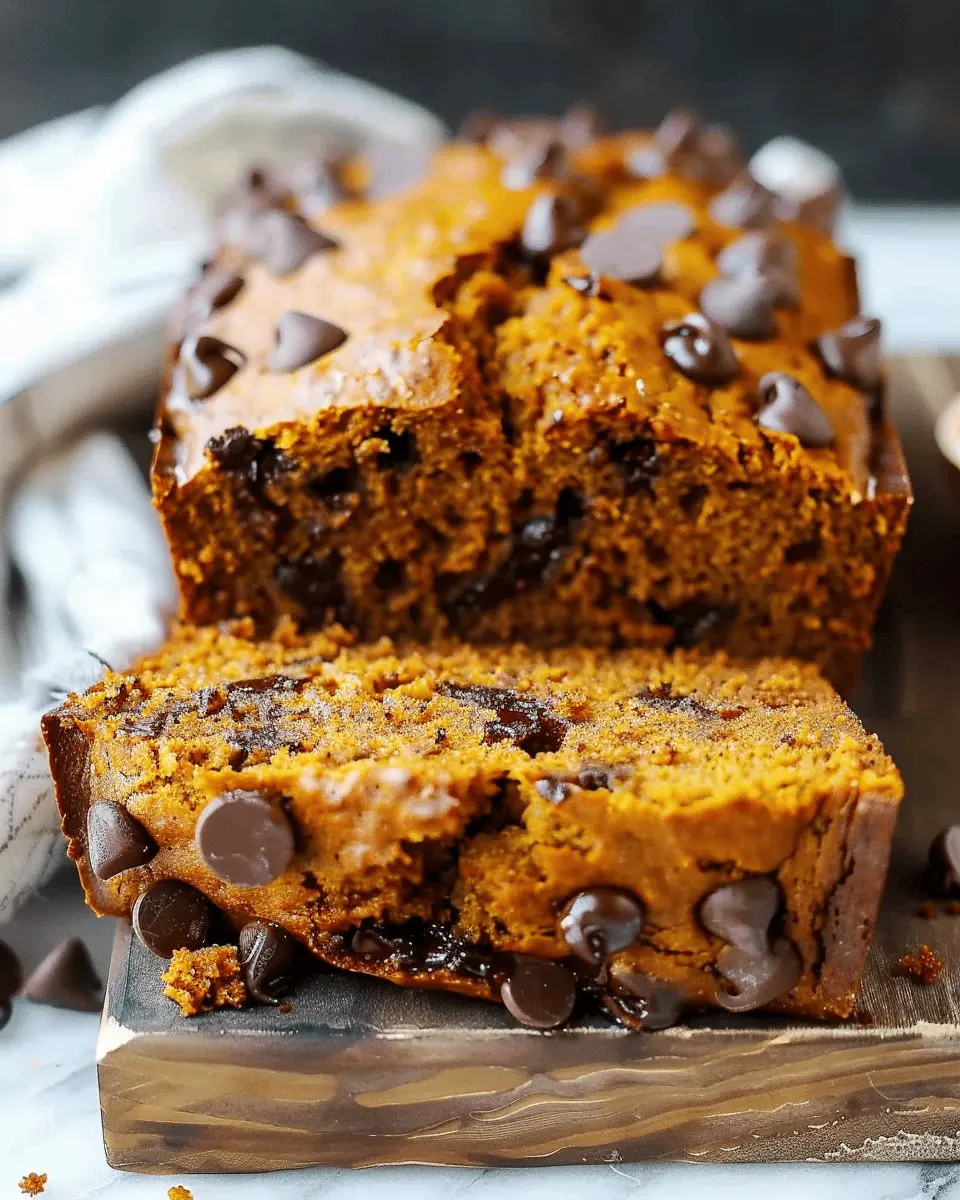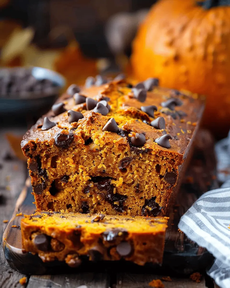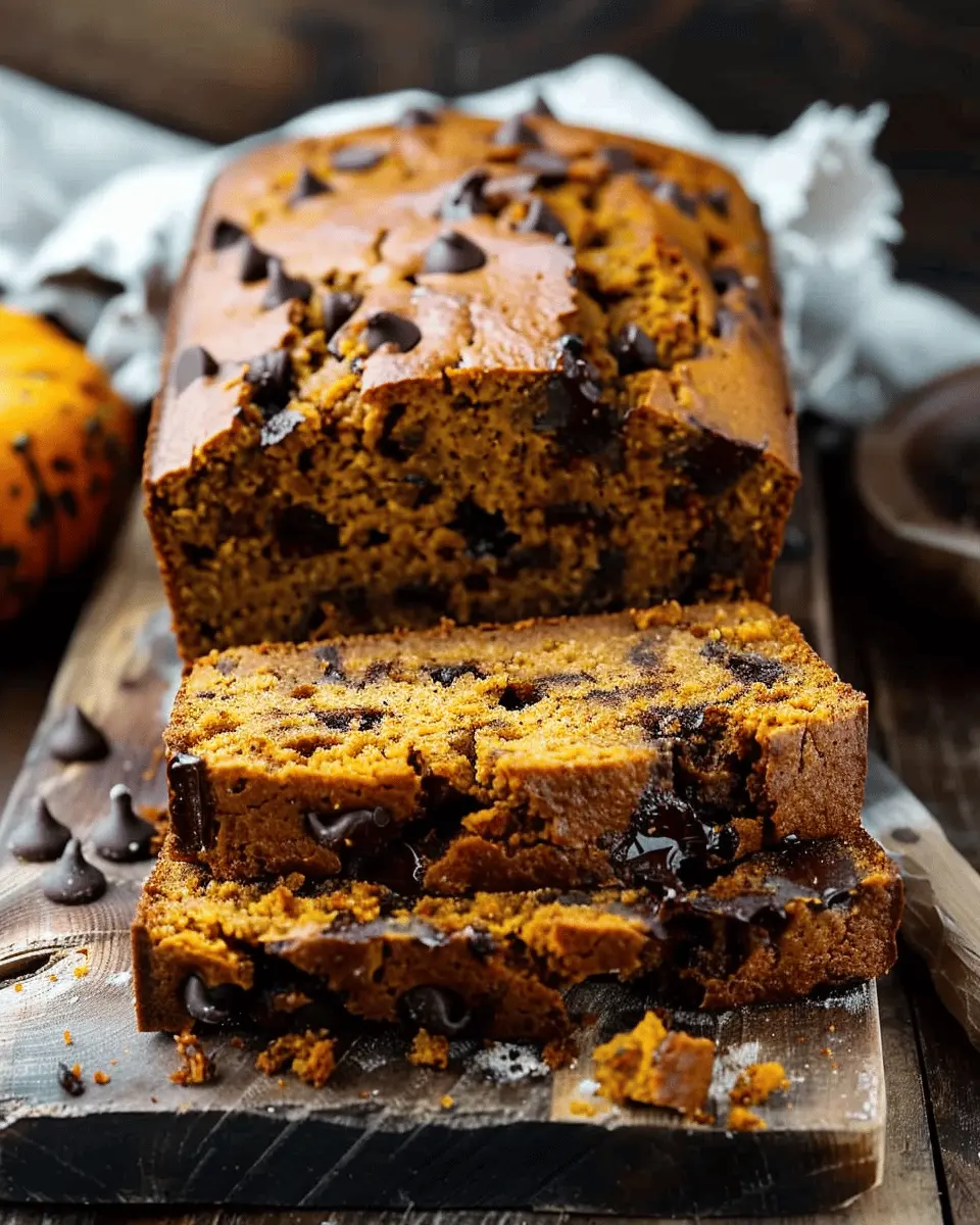 A deliciously moist and flavorful pumpkin bread loaded with chocolate chips, perfect for fall.