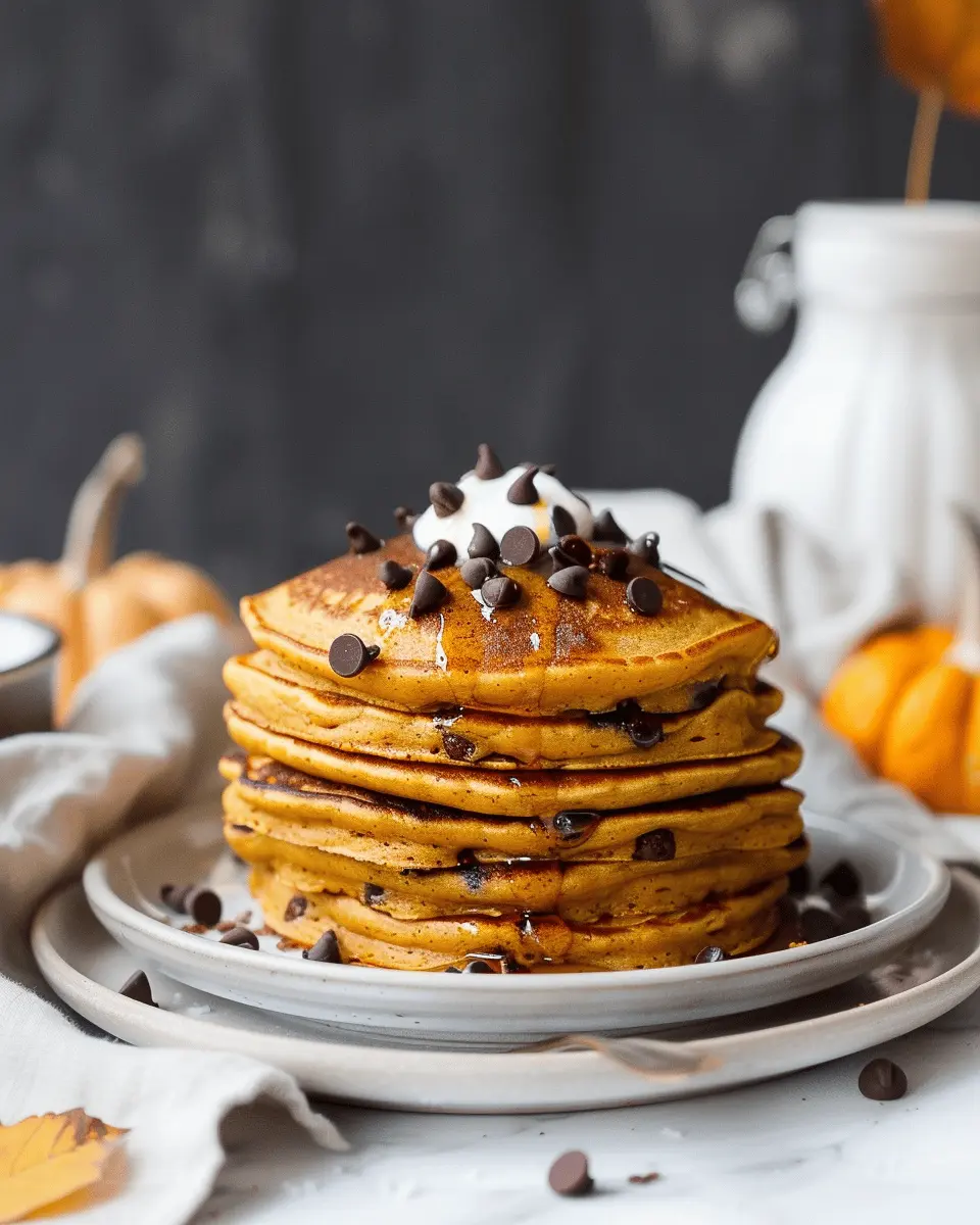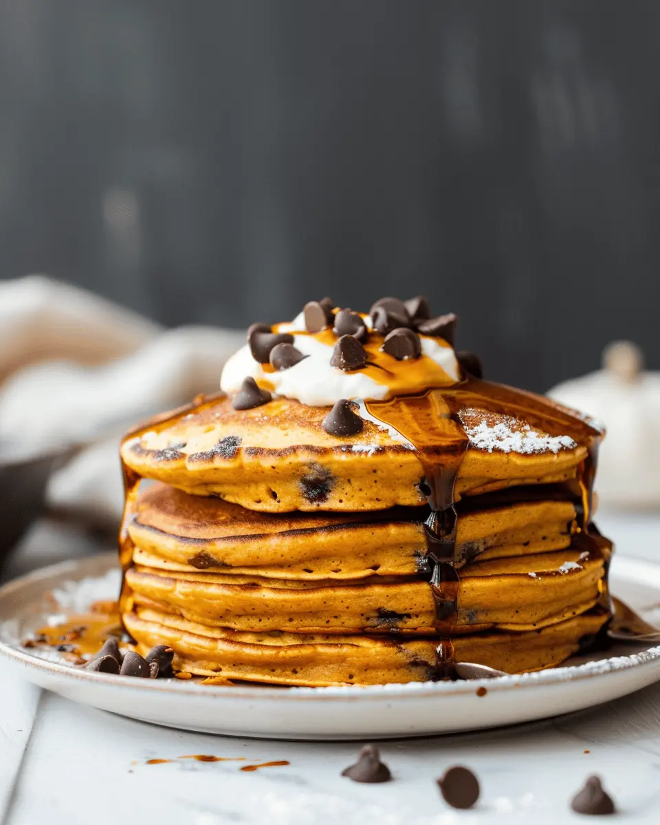 Elevate your pancake presentation! Try stacking your Fall Pumpkin Chocolate Chip pancakes high on a plate, drizzling with maple syrup, and sprinkling chopped nuts or chocolate shavings on top. For an artistic twist, dust powdered sugar in fun patterns or add fresh fruit like sliced bananas or pomegranate seeds.