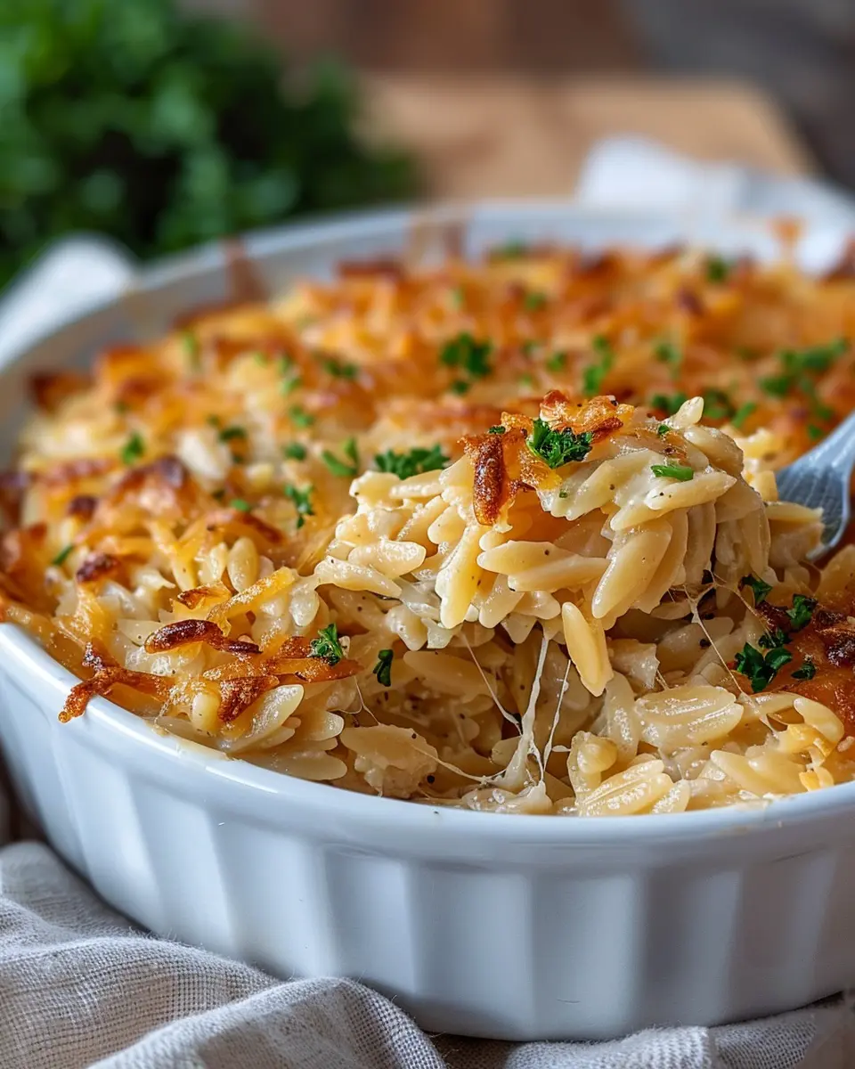 In summary, the French Onion Chicken Orzo Casserole is a delightful combination of flavors and textures that creates a memorable meal experience. It’s not just food; it’s a way to gather around the table with loved ones, share stories, and create lasting memories over a hearty dish. Now that you have an idea of what this casserole entails, stay tuned for the full recipe and get ready to make magic in your kitchen!