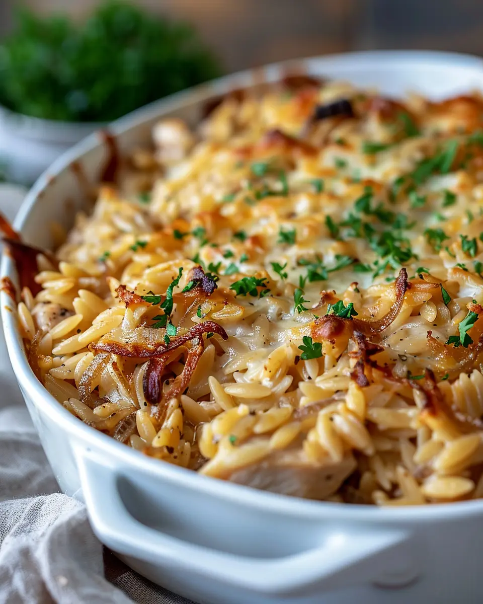 Keywords: French Onion Chicken Orzo Casserole, Casserole Recipes, Comfort Food