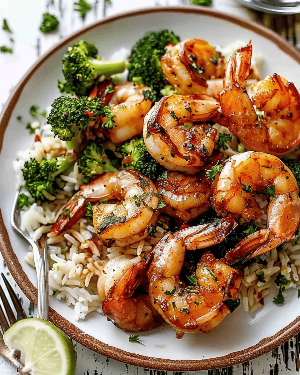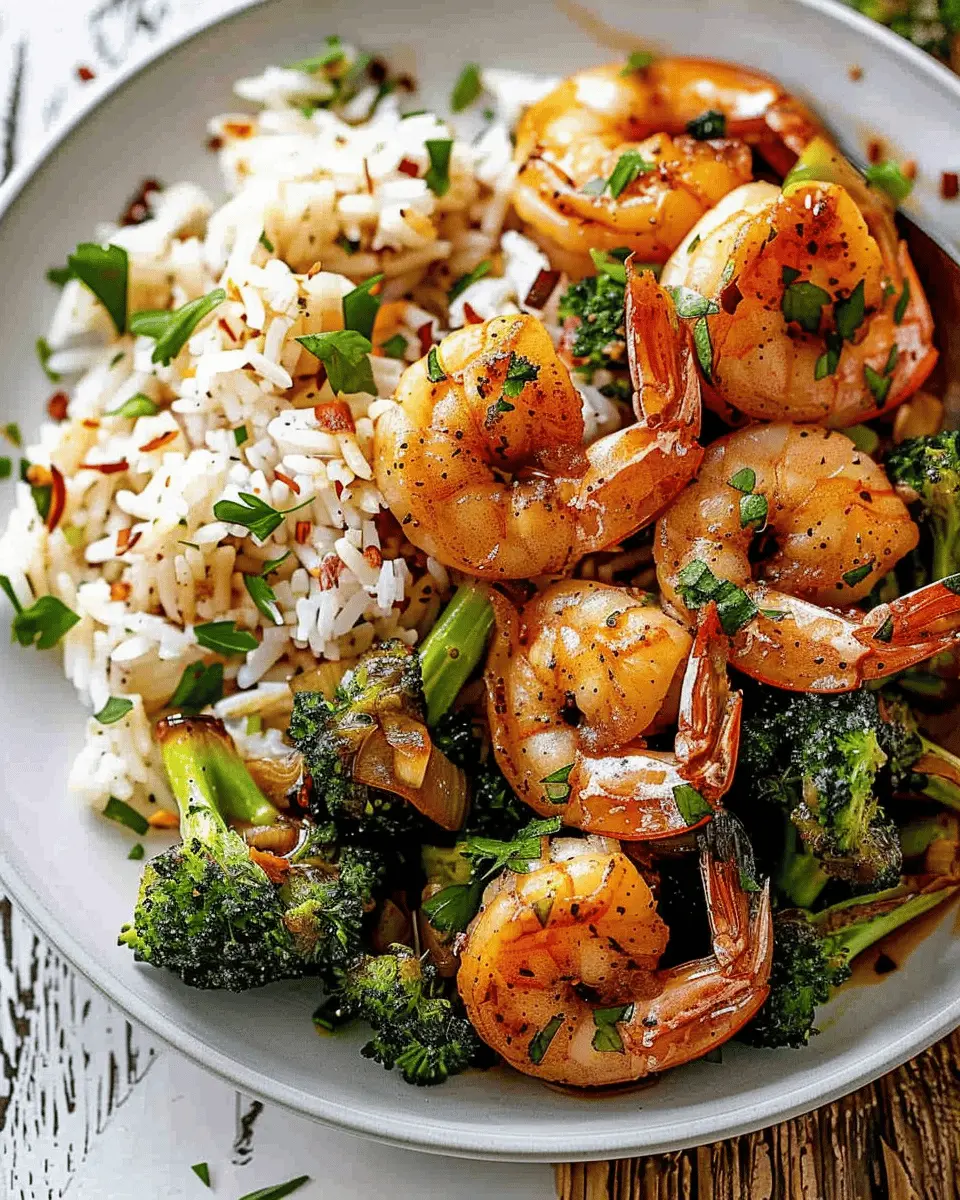 A delightful dish featuring succulent shrimp cooked in a rich garlic butter sauce served over a bed of broccoli rice.
