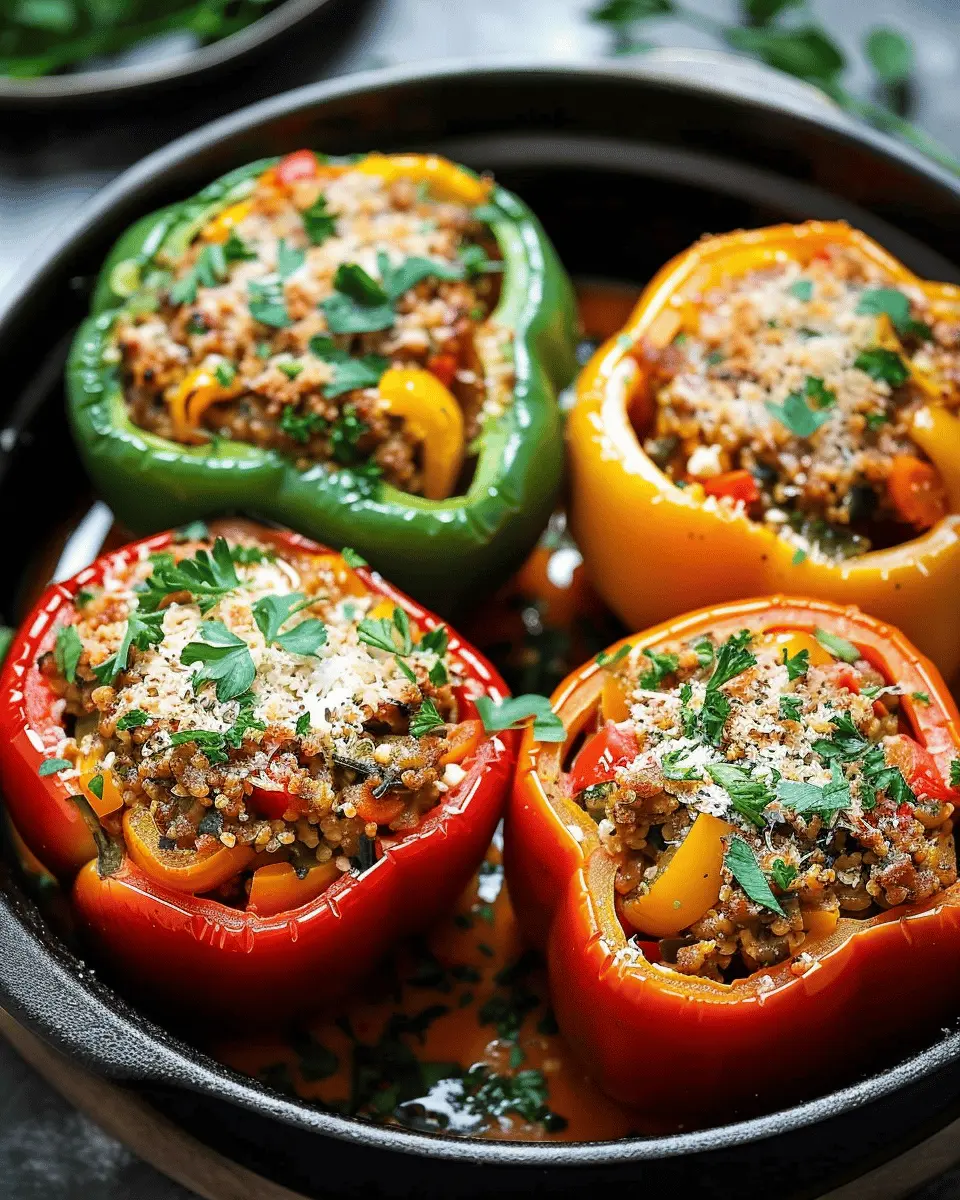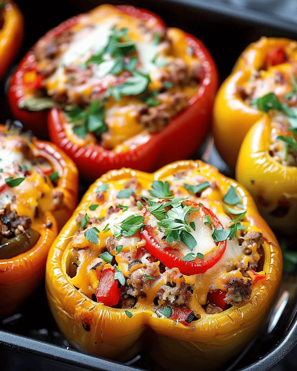 Now for the fun part—stuffing your peppers! Use a spoon to fill each bell pepper generously with your flavorful mixture. If you’re feeling festive, sprinkle some cheese on top before placing them in the oven. Bake at 375°F (190°C) for about 25-30 minutes, or until the peppers are tender yet maintain their shape.