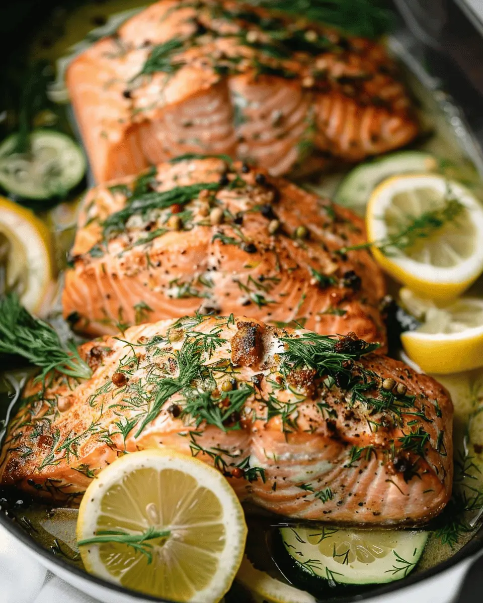 Top with your salmon fillet, and garnish with a sprinkle of additional dill or a lemon wedge for an extra touch.