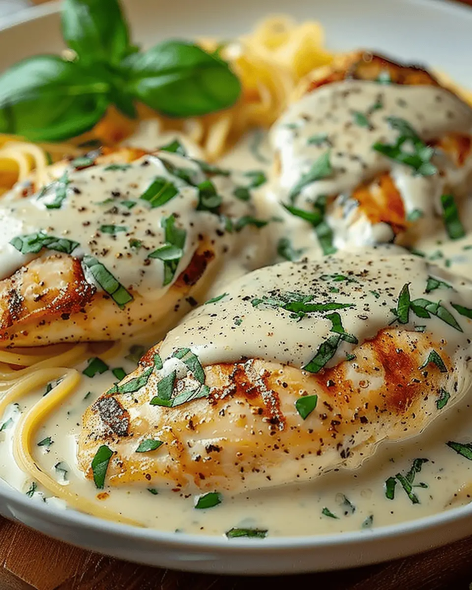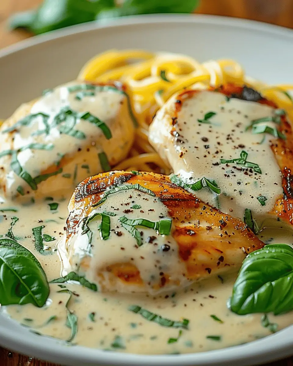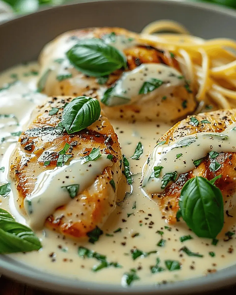 PrintMozzarella Chicken in Basil Cream Sauce: A Creamy Delight for Dinner
