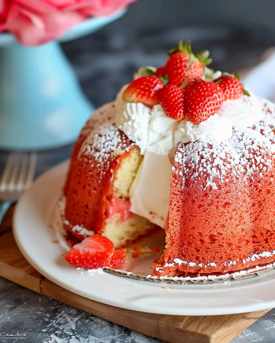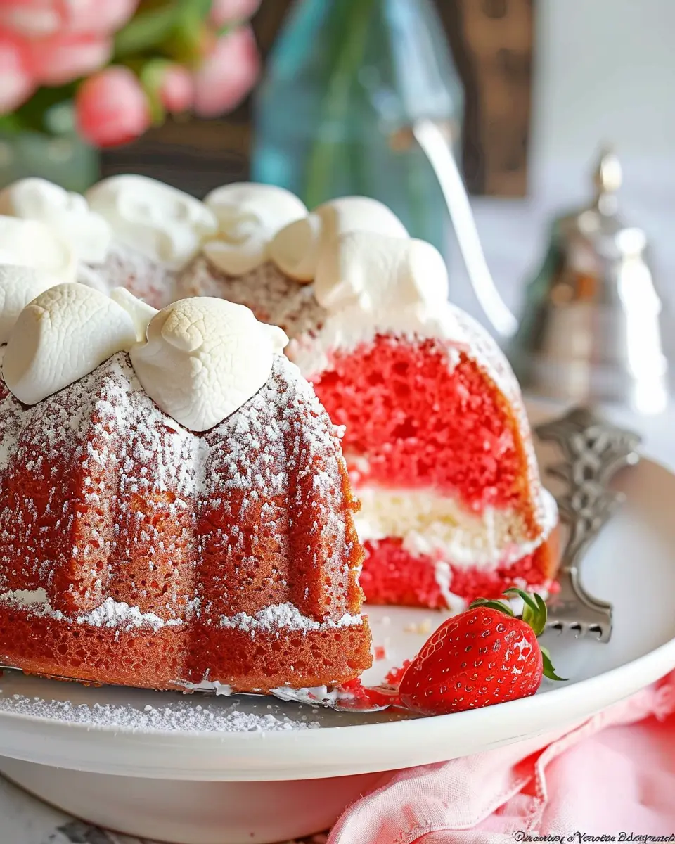 A rich and delicious Strawberry Bundt Cake filled with a sweet marshmallow cream, perfect for any occasion.