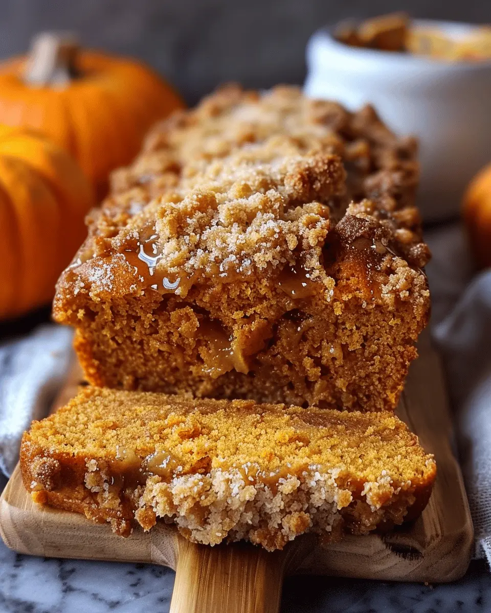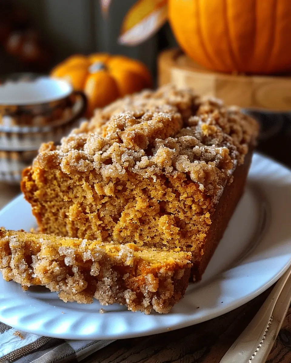 A delicious pumpkin loaf topped with a crunchy streusel, perfect for a comforting treat at home.