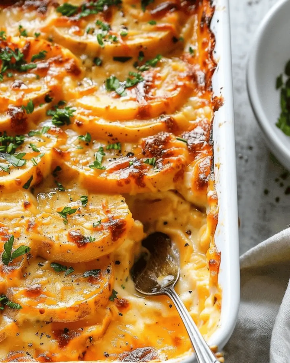 Keywords: sweet potato recipes, au gratin, cheesy potatoes, comfort food