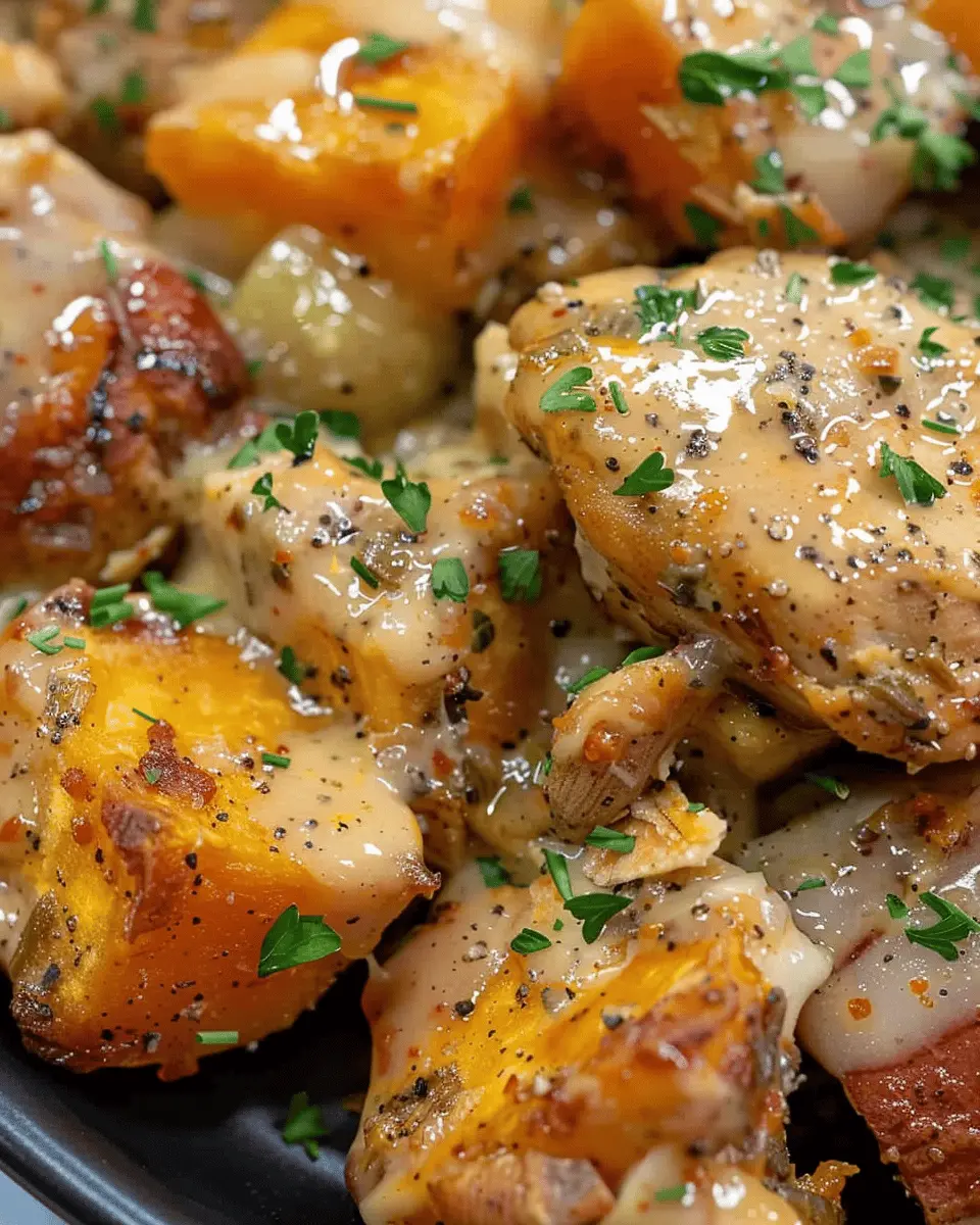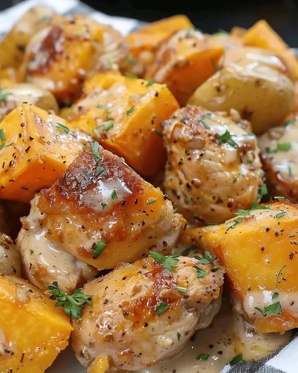 - Pour the mixture over the chicken and sweet potatoes.
